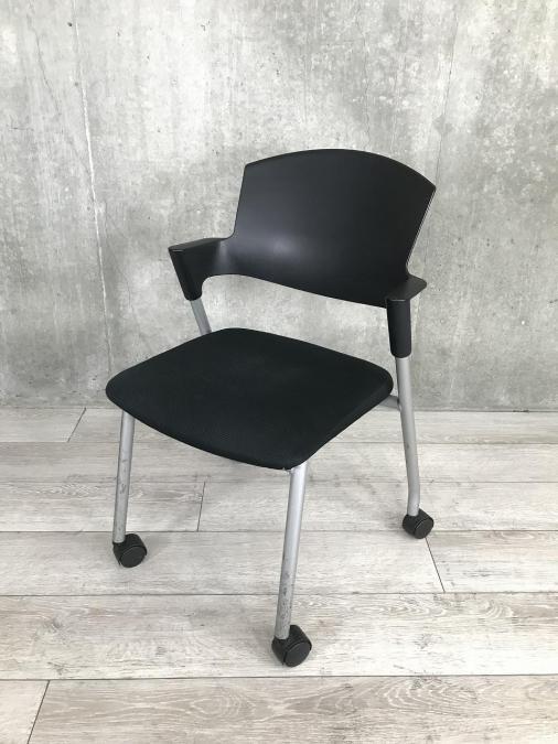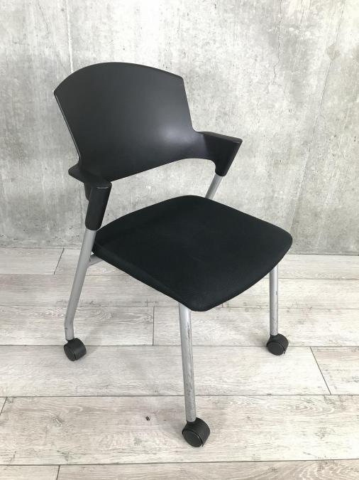 【6/16・8脚入荷予定!】【シンプルスマートなスタッキングチェア!分厚いクッションで長時間でも快適な座り心地!】■コクヨ製 プロッティ スタッキングチェア 肘付ミーティングチェア ■固定肘 ■キャスター付 ■ブラック ■背面樹脂 オフィスバスターズ梅田本店