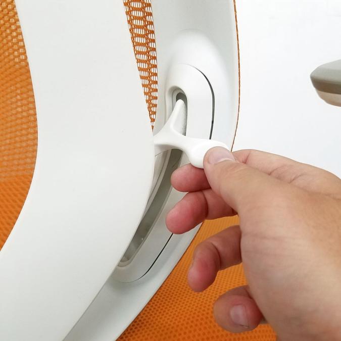 - 座面右下のダイヤル操作で、リクライニングの強弱調整が行えます。これまでのダイヤル式よりも、少ない回転数で、最弱?最強の調整が可能です。