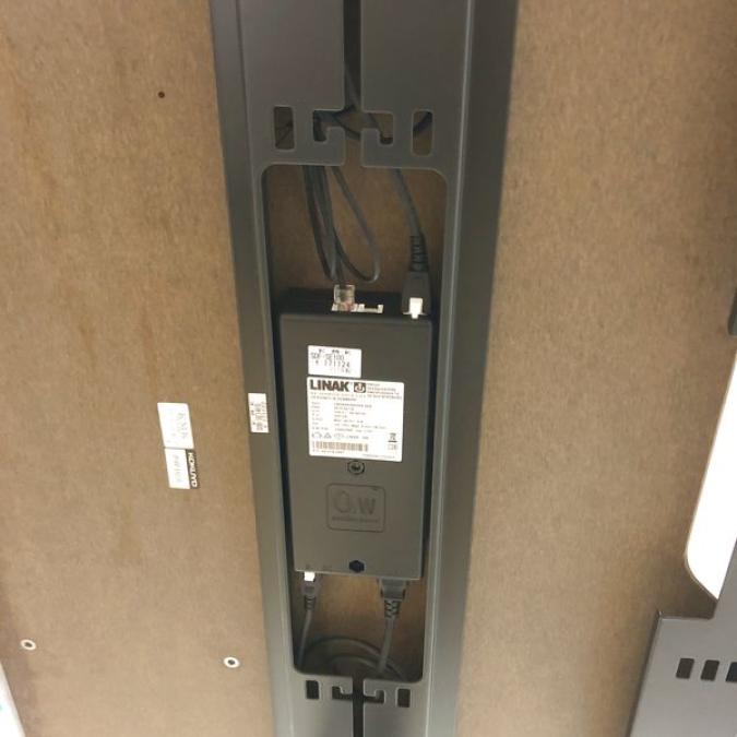 上下に移動させることで机の高さを調節可能になっています。また、天板の一部にコードを通すための穴があり配線周りがスッキリします。
