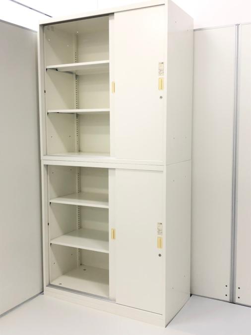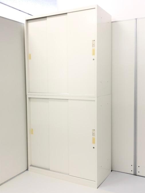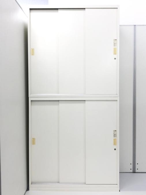 オカムラ製 レクトラインシリーズ ホワイト シリンダー W800xD450xH2150サイズ W800サイズ スリムサイズ 3枚戸タイプ ハイキャビネット スライド引き戸だから開閉スペースに困らない! 上下書庫セット 3枚引き違い書庫セット!!