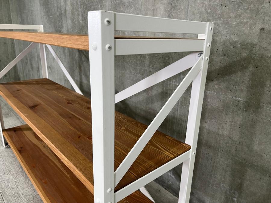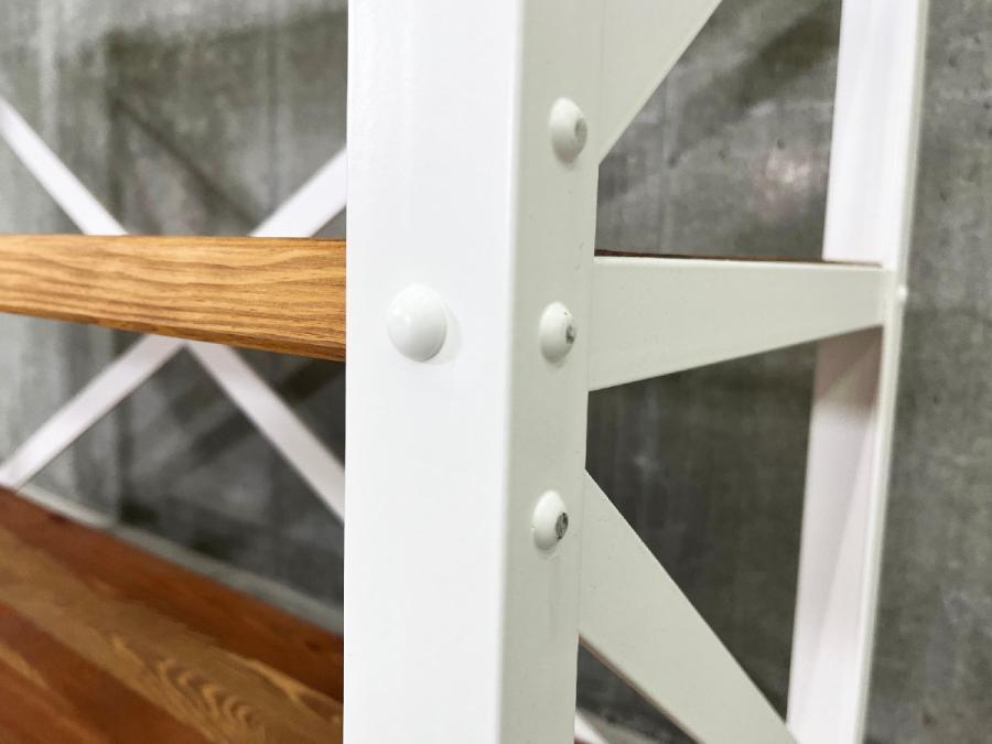 リベット留めされたスチールフレームが、ヴィンテージな雰囲気も漂うシェルフ。