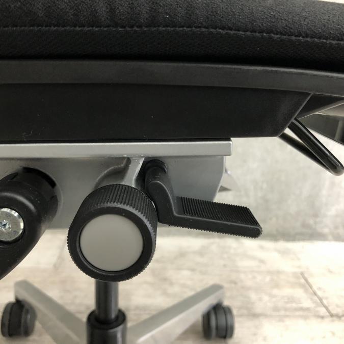 - レバーを引き上げながら座面を前後にスライドさせ、レバーを放すとロックします。背もたれに身体をつけた状態で膝の裏側と座面のエッジの間に5-8センチほどの隙間ができるのが理想的です。
