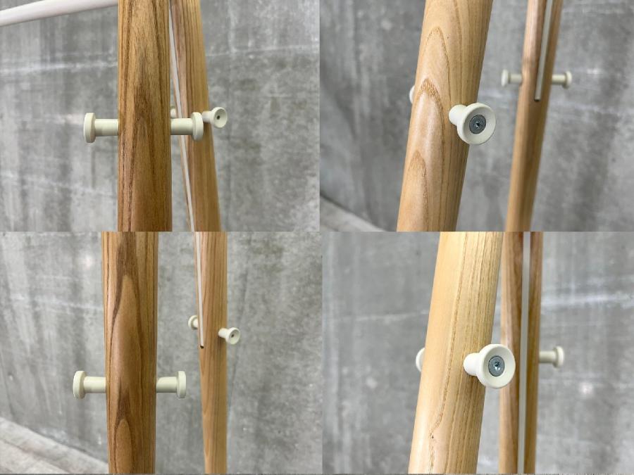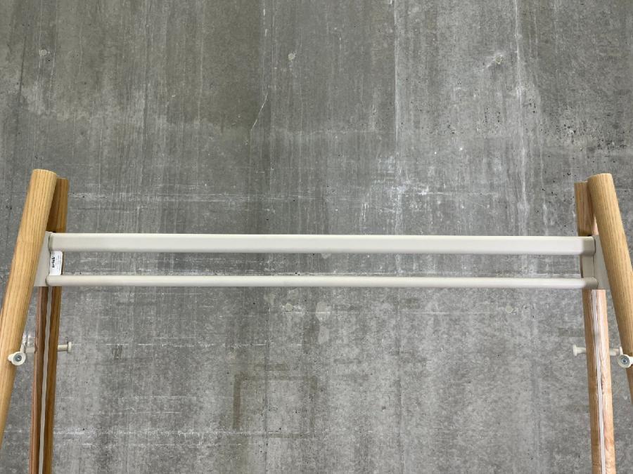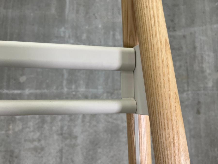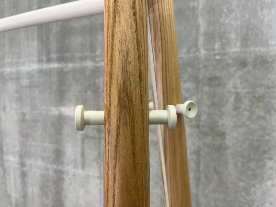 2本のアッシュ材による支柱に、スチールの棒が横に渡され、接続部はバッグや帽子などをかけるフックとしても使うことができます。シンプルで明快なデザインかつ実用的な収納アイテムです。