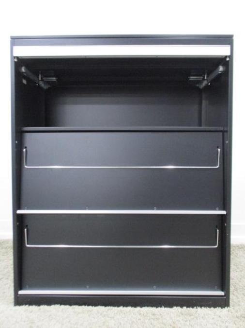 フラップ扉を開けた内部にも収納スペースがあるキャビネットです。