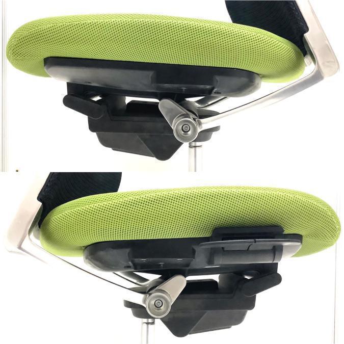 - 座る人の体格に合わせて、シート奥行きは前後54mm、高さ100mmの調整が可能です。また、調整レバーを座面シートの側面に設けることで、座ったままの姿勢で操作することができます。