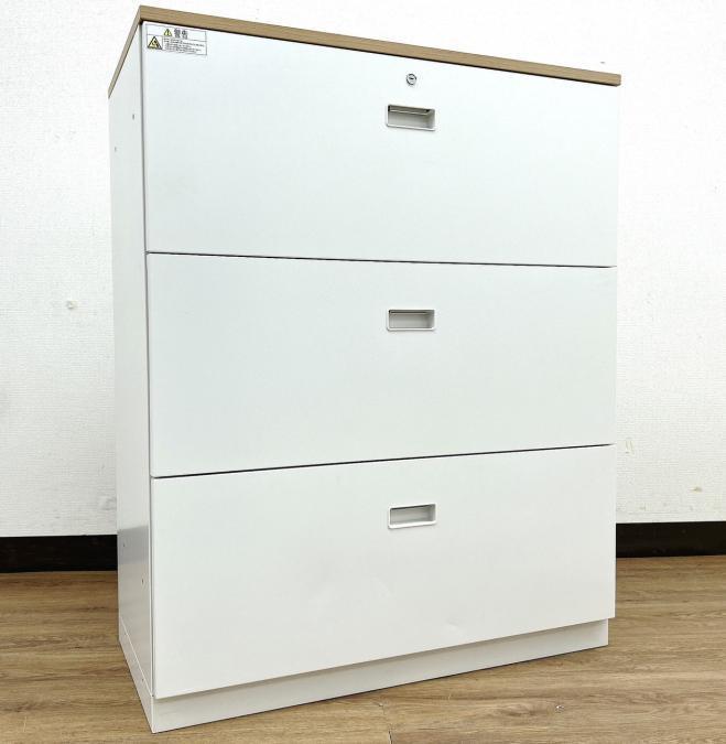 【A4ファイルも沢山収納可能!ホワイトカラーの人気シリーズ3段ラテラル書庫!】/オススメ(おすすめ) /人気商品【弊社使用欄:A01013834】3段ラテラル書庫/ローキャビネット/天板付き/ホワイト/シリンダー錠/ITOKI/THIN LINE■イトーキ/シンライン※取っ手部分日焼あり