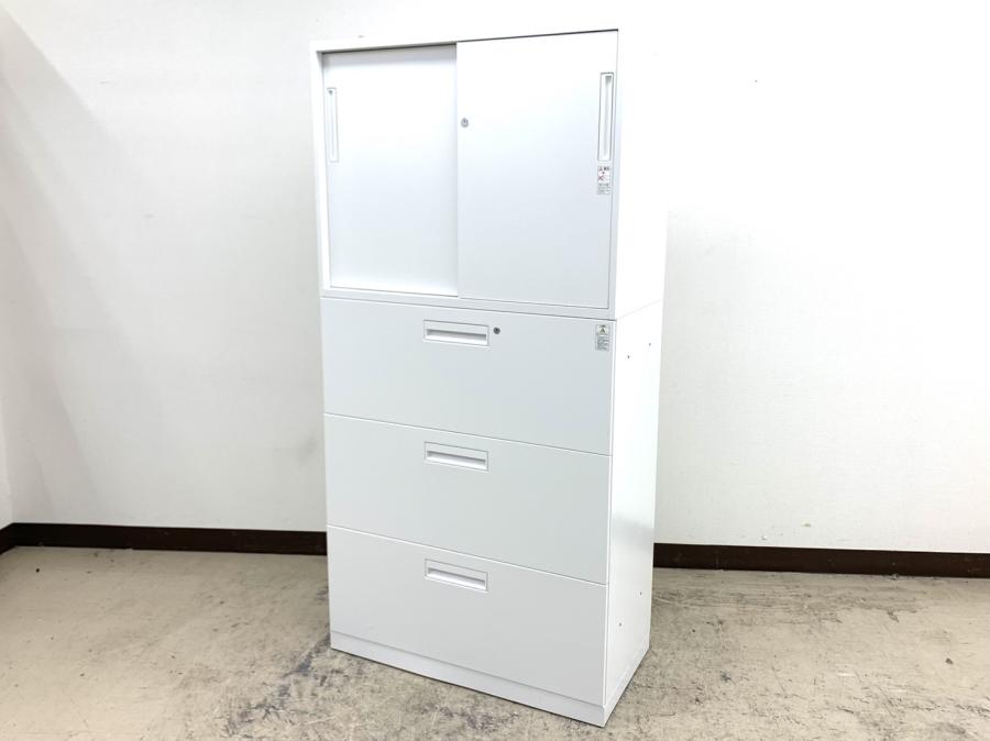 【オフィスの書類をまとめて整理!引き違いと引き出し式の書庫セット!】■コクヨ(KOKUYO)製 エディア(EDIA) 引き違い+3段ラテラル 上下書庫セット 2枚扉 H2150㎜ ■シリンダー錠 ■ホワイト