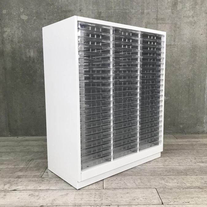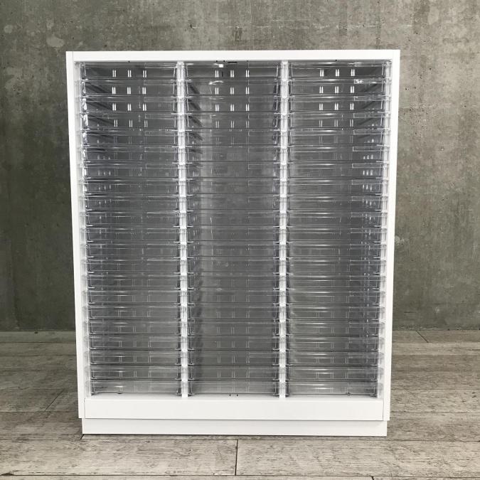【書類・備品整理の必需品!】【珍しいクリトレが入荷!3列×浅型11段+深型5段】■イトーキ(ITOKI)製 シンラインシリーズ クリスタルトレー ローキャビネット ■3列×浅型11段+深型5段 ■天板・ベース付 ■色:ホワイト