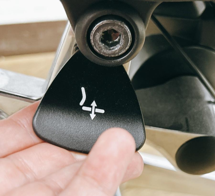 両手を自然に下ろした位置にあるレバーにて、座面の前後スライド調整(前後50mm)が