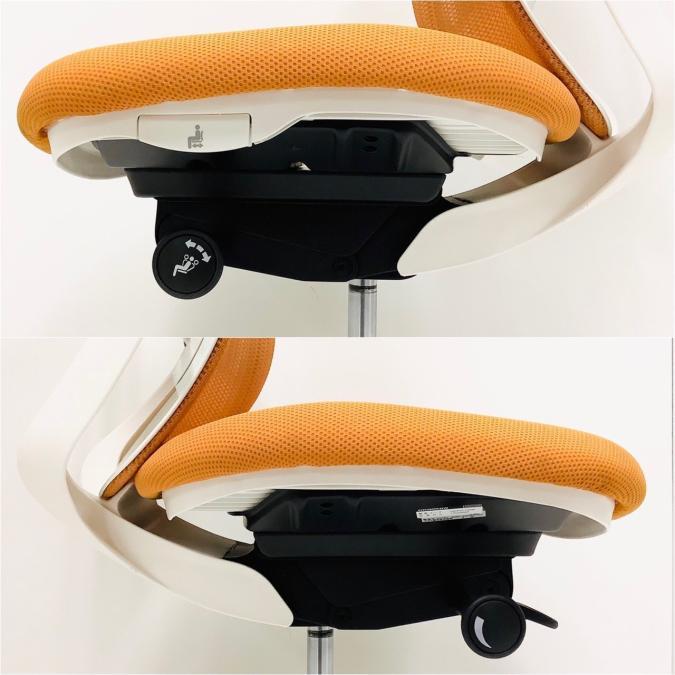 - 座面の左にあるレバー操作により、座面の奥行き調整が可能です。(ストローク:50mm)
