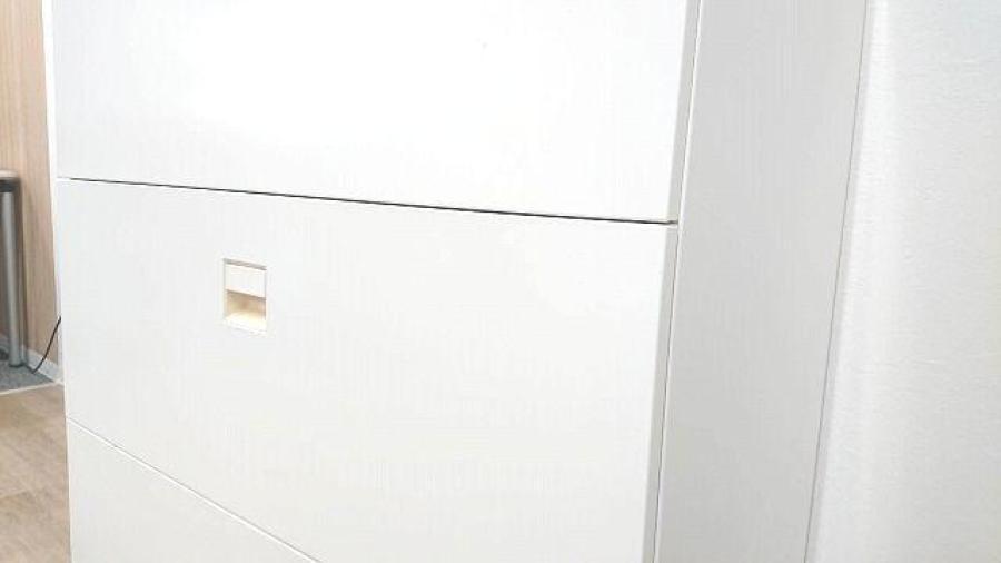 【大きく開いて収納物が見やすく、収納力も抜群!どの空間でも使いやすいホワイトカラー!】■オカムラ(okamura)製 SAデュオラインシリーズ 3段ラテラル ローキャビネット W900×D450㎜ ■シリンダー錠 ■ホワイト ■天板付