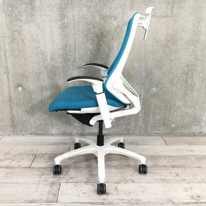 【姿勢の変化にフレキシブルに対応!スタイリッシュで座り心地も抜群な高機能チェア】■イトーキ(ITOKI)製 エフ(f)チェア 肘付き ハイバック 背面メッシュ ■可動肘・ハンガー付 ■ストロングブルー×ホワイトシェル ※日焼け有