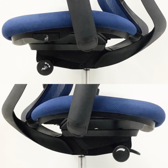 - 座面の左にあるレバー操作により、座面の奥行き調整が可能です。(ストローク:50mm)
