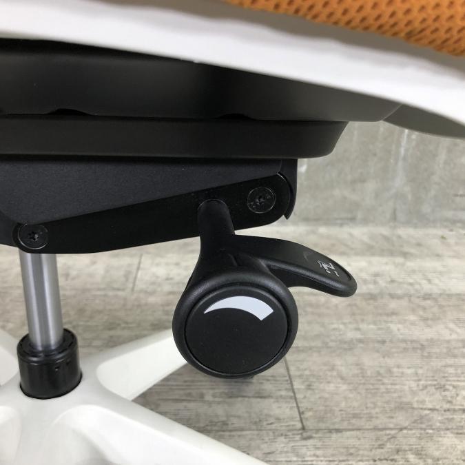 - 座面右下のダイヤル操作で、リクライニングの強弱調整が行えます。これまでのダイヤル式よりも、少ない回転数で、最弱?最強の調整が可能です。