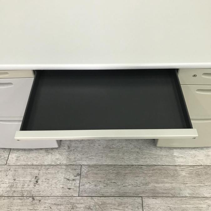 - 袖机のワゴンは、最下段がロング引出しになっており、従来より収納力120%アップ。