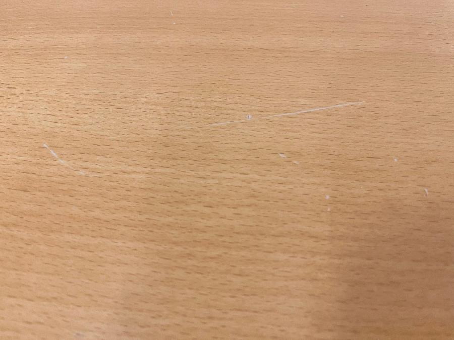 - 目立つ箇所あり傷・凹みが多数、深い傷・凹みが一部ある。(例、天板、幕板、棚板、サイド部分、脚部等にある。)