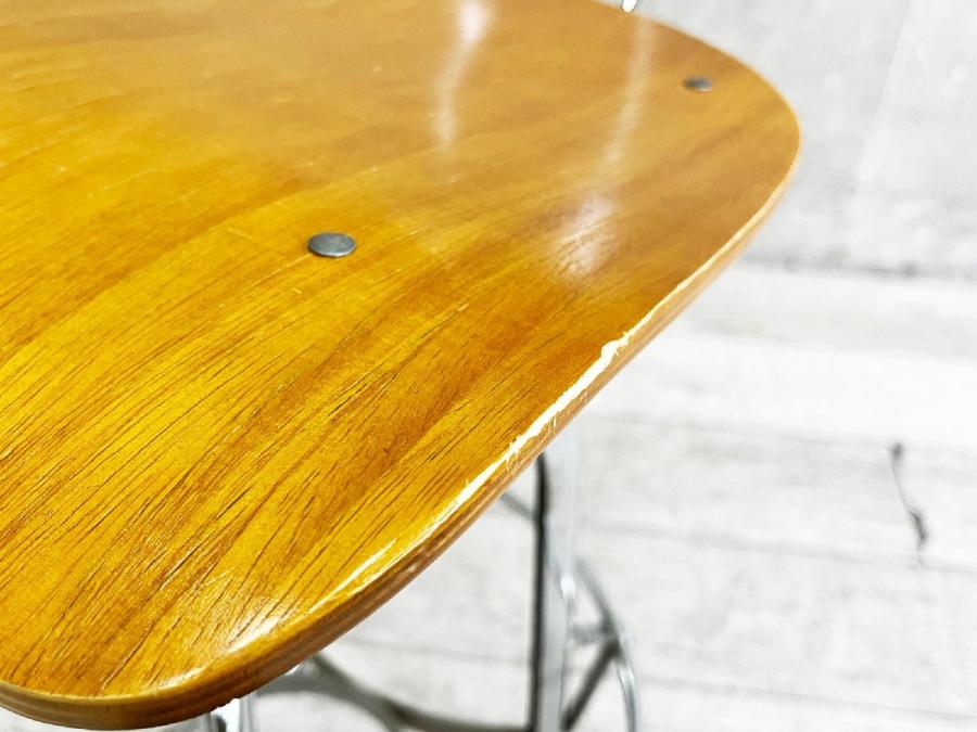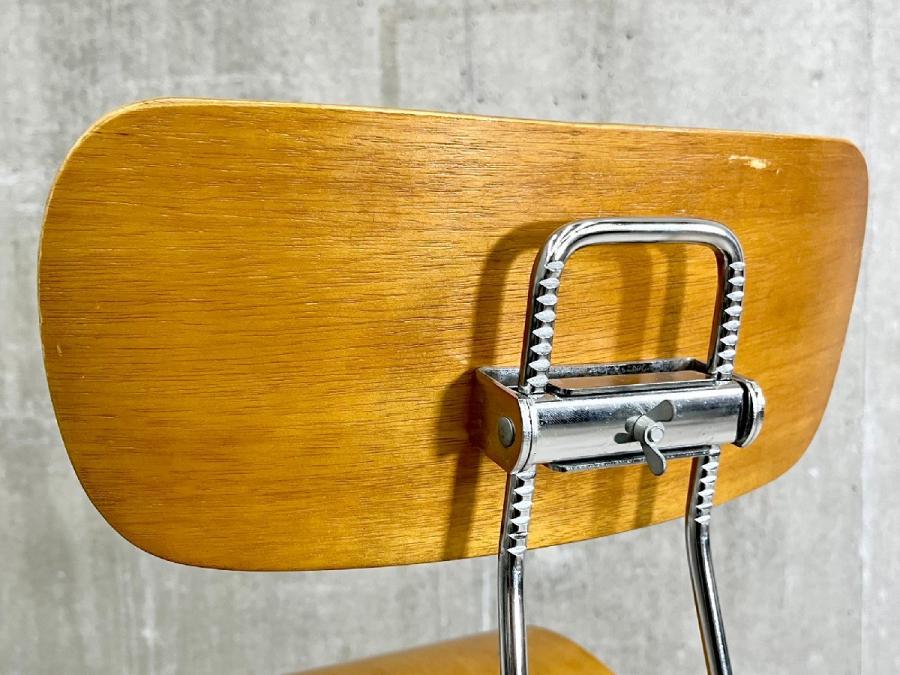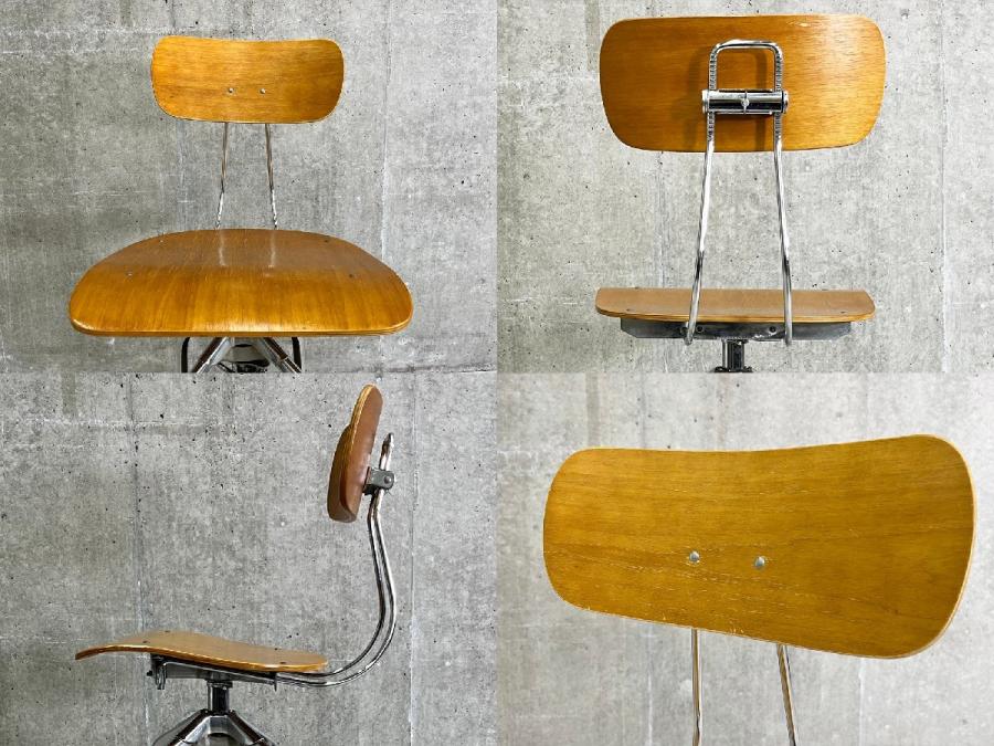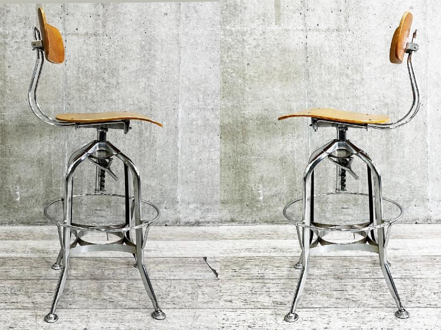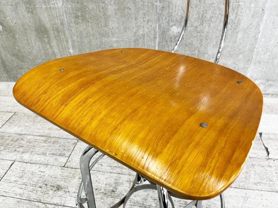 シート下のレバーでシートを昇降させる、アナログな構造がインダストリアルなテイストにピッタリとはまるアイテムです。バックレストも高さが調整できる仕様ですので、身長や用途に合わせて使えます。