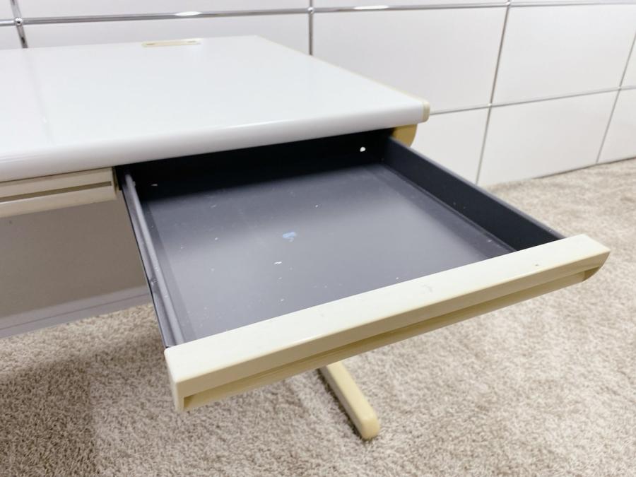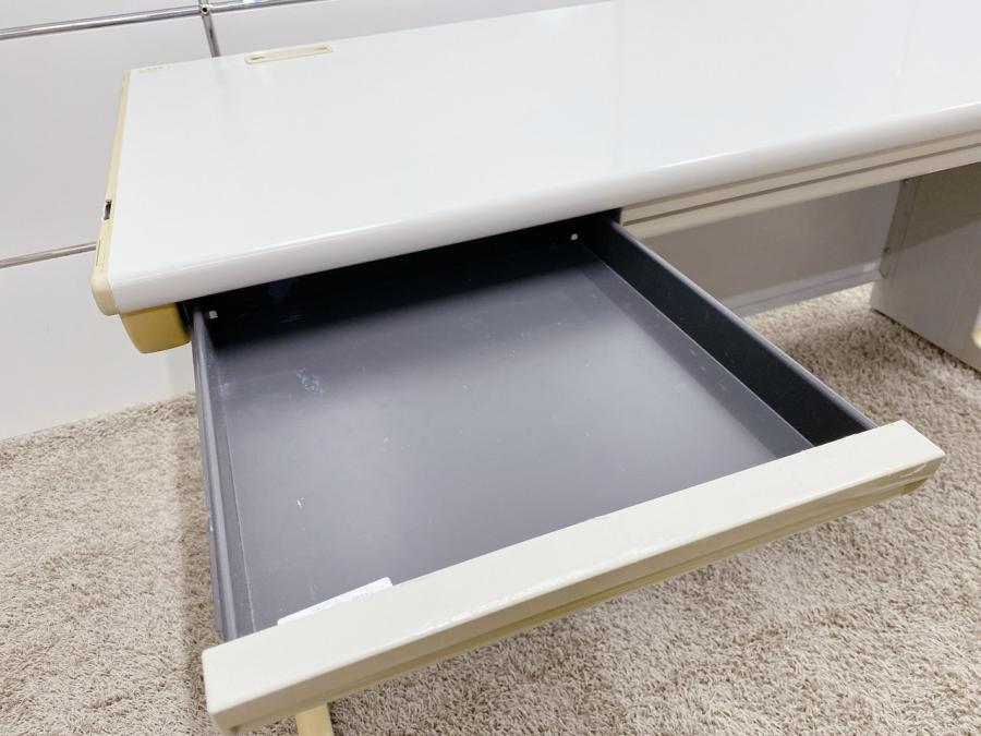 - 袖机のワゴンは、最下段がロング引出しになっており、従来より収納力120%アップ。