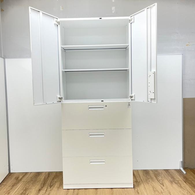 【収納量抜群の書庫セット!観音開き+引き出しタイプの人気の組み合わせ!】■コクヨ(KOKUYO)製 エディアシリーズ(EDIA) 両開き+3段ラテラル 書庫セット ハイキャビネット ■ホワイト ■シリンダー錠