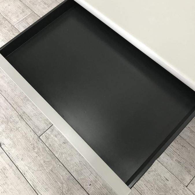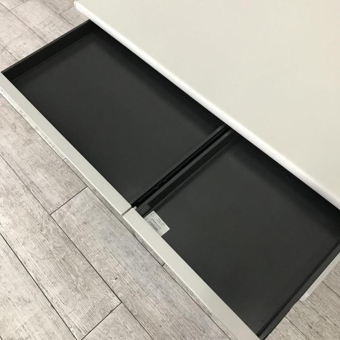 - 袖机のワゴンは、最下段がロング引出しになっており、従来より収納力120%アップ。
