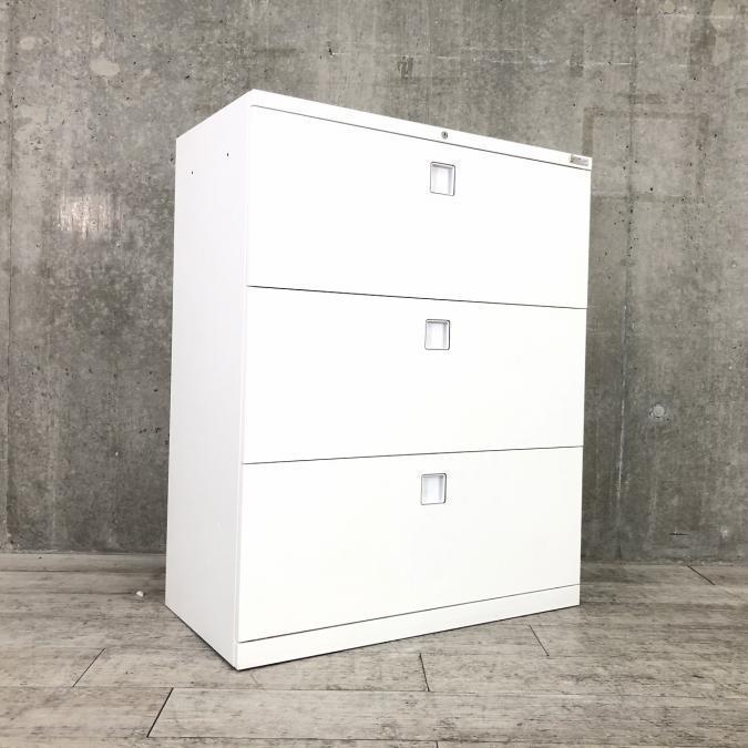 ■オカムラ(okamura)製 レクトラインシリーズ 3段ラテラル ローキャビネット ■天板・ベース付 ■シリンダー錠 ■ホワイト ■収納力抜群 外部倉庫在庫