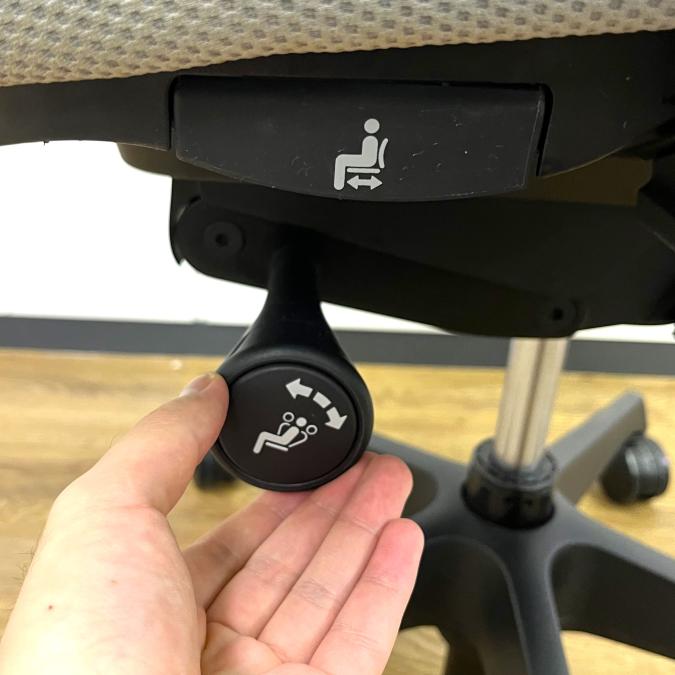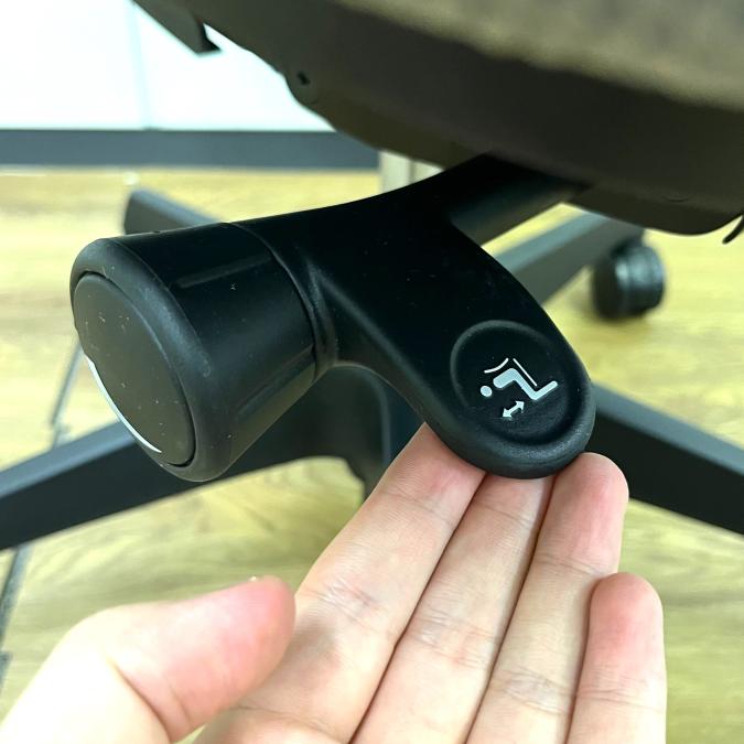 - 座面右下のダイヤル操作で、リクライニングの強弱調整が行えます。これまでのダイヤル式よりも、少ない回転数で、最弱?最強の調整が可能です。