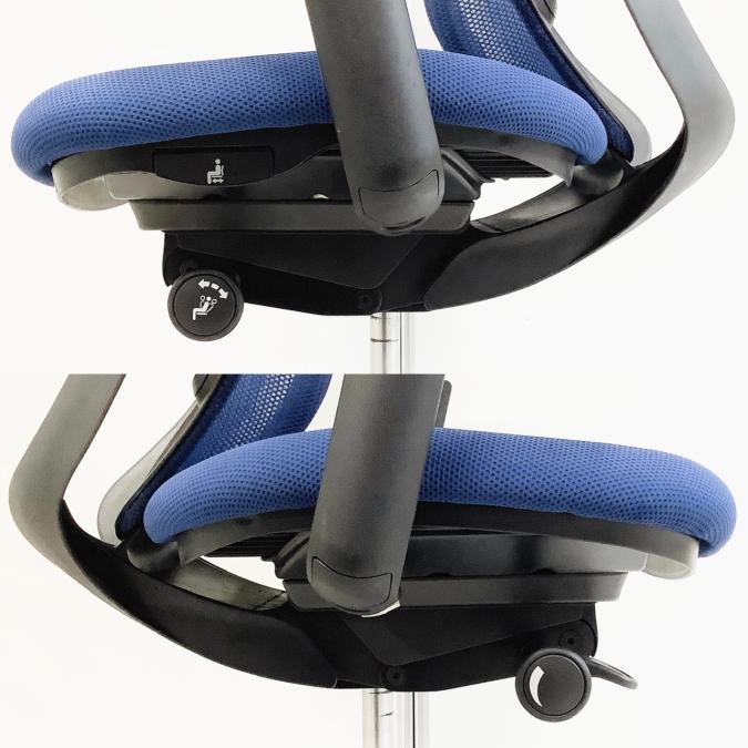 - 座面左下のダイヤルでリクライニングの固定と解除が行えます。 前傾ポジションをとることも可能です。