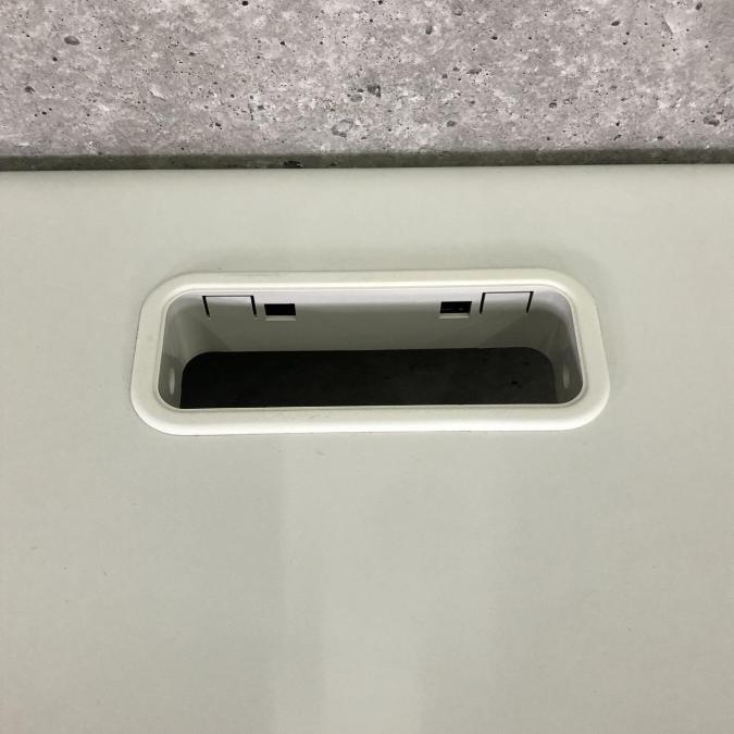 フロント部幕板上部から天板の配線穴を等して通線ができます。