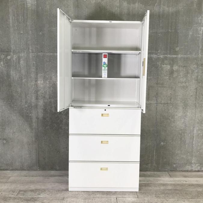 【在庫入替セール品!】【大量収納】イトーキ シンライン ホワイト 上下書庫セット(上:両開き 下:3段ラテラル)【取っ手に日焼けあり】- 足立・葛飾店