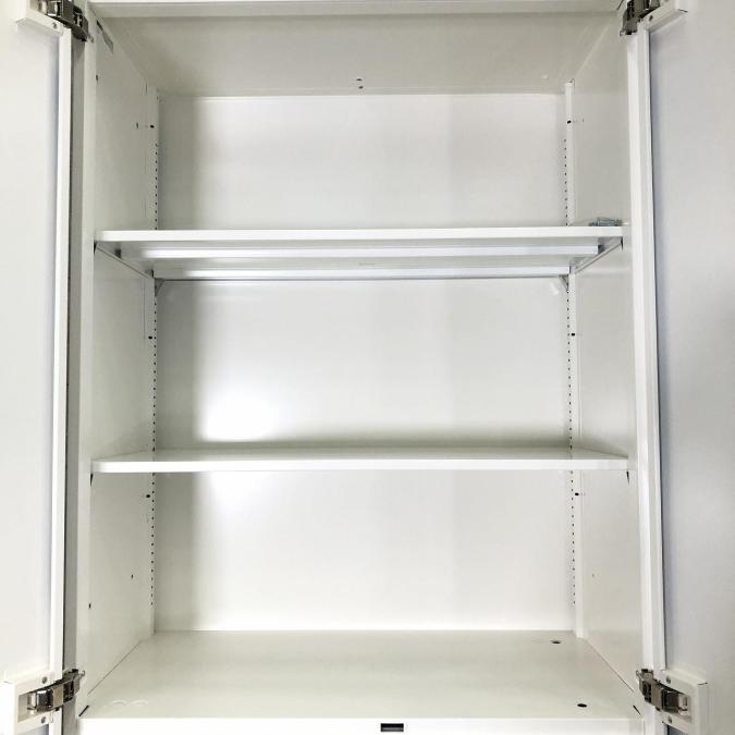 上段はA4ファイルが3段収納可能な両開き書庫。