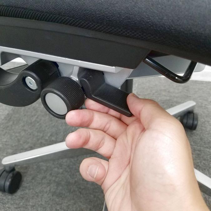 - レバーを引き上げながら座面を前後にスライドさせ、レバーを放すとロックします。背もたれに身体をつけた状態で膝の裏側と座面のエッジの間に5-8センチほどの隙間ができるのが理想的です。