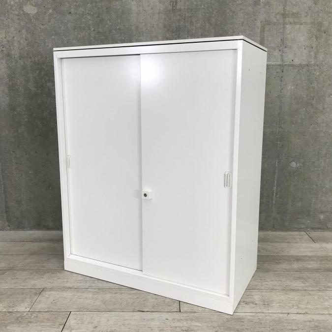 スライド式の扉のため導線を邪魔しません!使い勝手抜群の2枚引き違い書庫が入荷! ■オカムラ/レクトライン/ホワイト 2枚引き戸