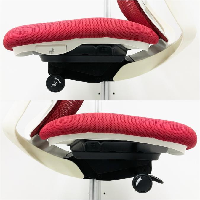 - 座面の左にあるレバー操作により、座面の奥行き調整が可能です。(ストローク:50mm)