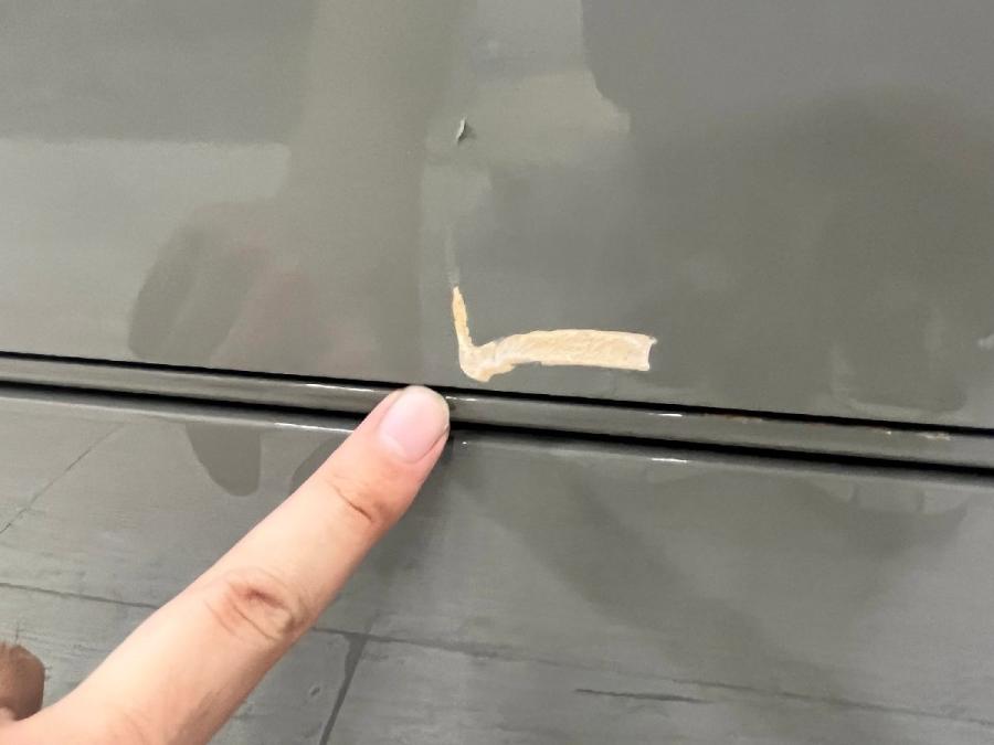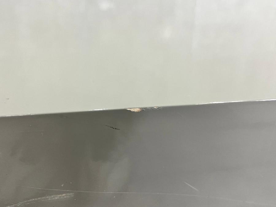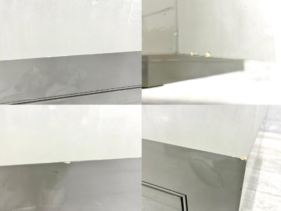 - 目立つ箇所複数あり深い傷・凹みが商品全体にある。(例、天板、幕板、棚板、サイド部分、脚部等にある。)