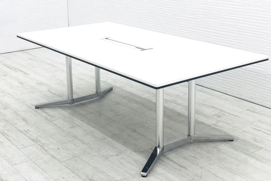 【1台限定】高級会議テーブル 配線ダクト付き ポリッシュ脚/ホワイト天板【ラティオ】W2100×D1100- 東大阪店