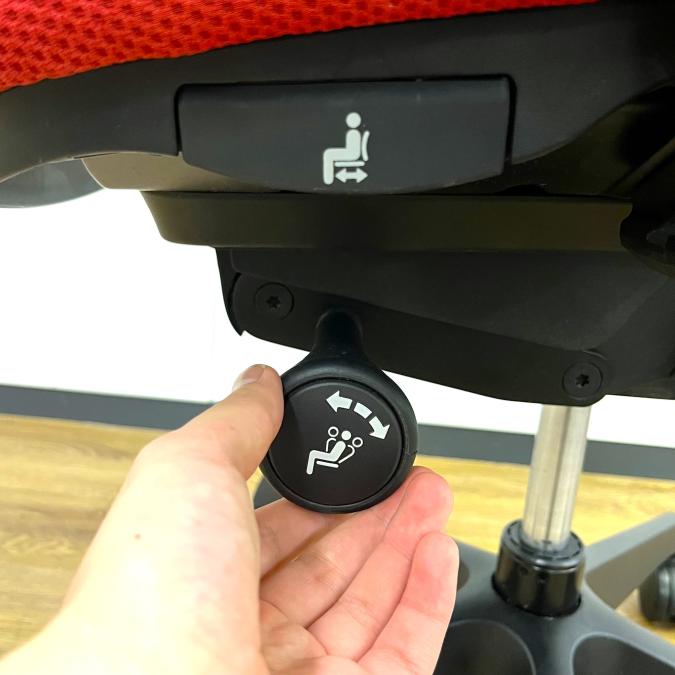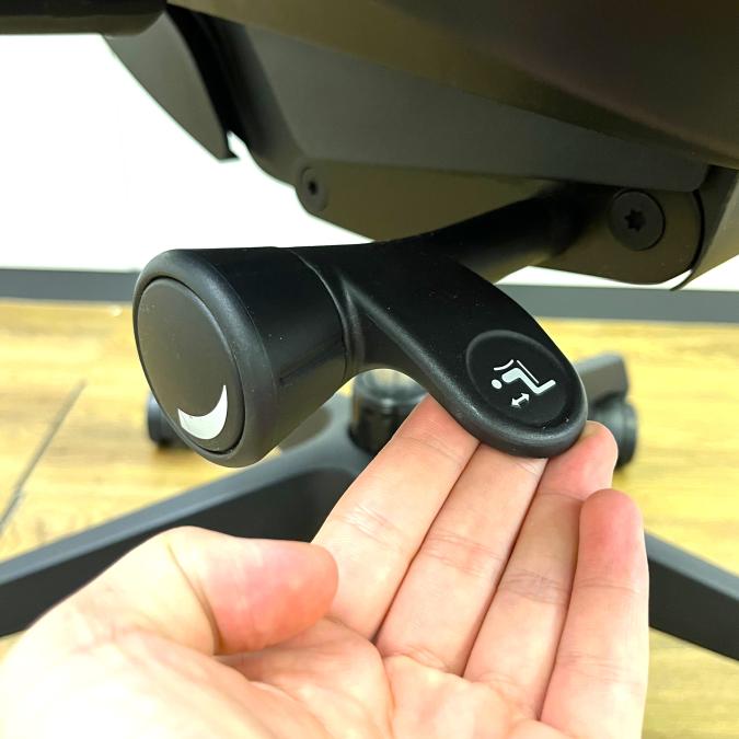 - 座面右下のダイヤル操作で、リクライニングの強弱調整が行えます。これまでのダイヤル式よりも、少ない回転数で、最弱?最強の調整が可能です。