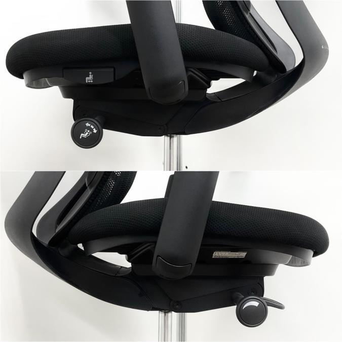 - 座面右下のダイヤル操作で、リクライニングの強弱調整が行えます。これまでのダイヤル式よりも、少ない回転数で、最弱?最強の調整が可能です。