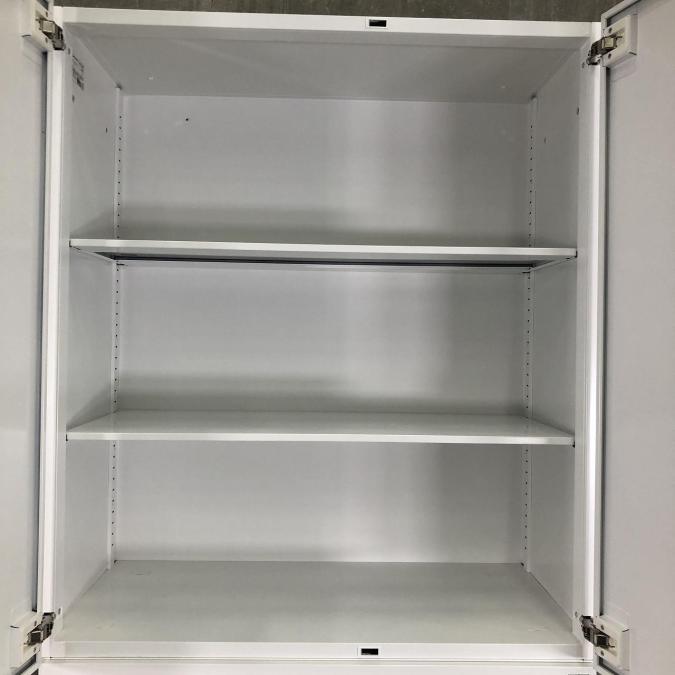 人気のホワイトカラーで上が両開き書庫で下が3段ラテラル書庫になります。