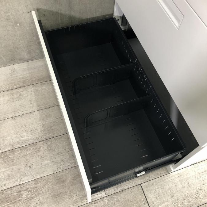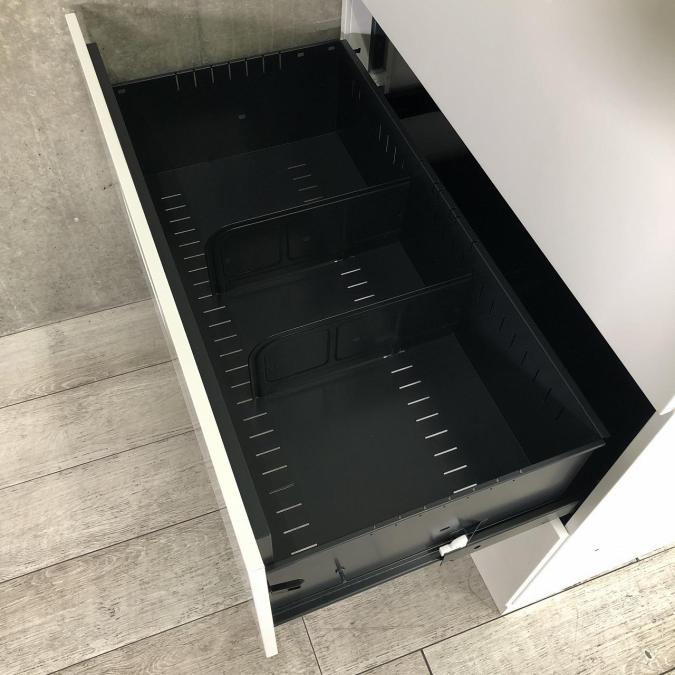 - 両開きタイプは扉が180度開き、通路の邪魔になりません。ラテラルタイプは引出しが限界まで出せ、出し入れ楽々。