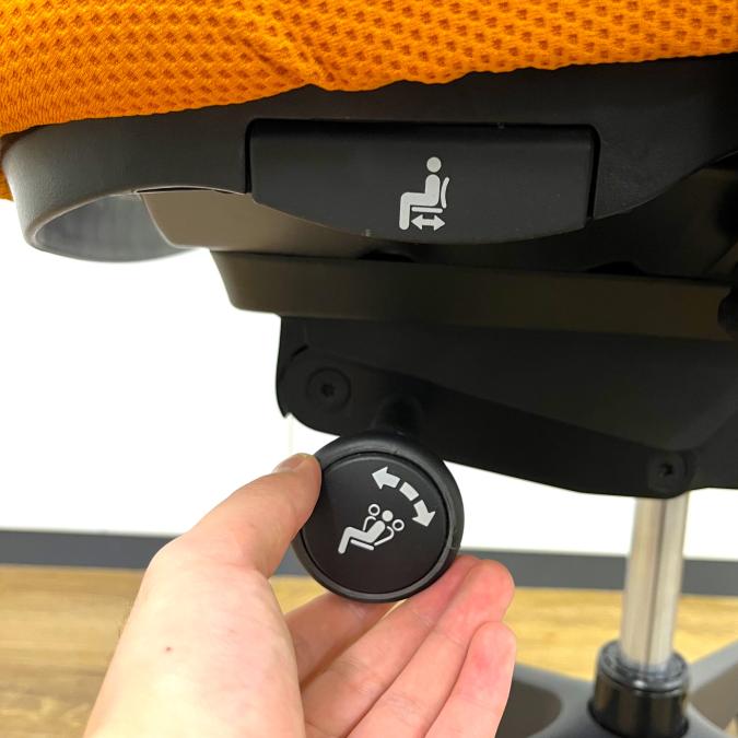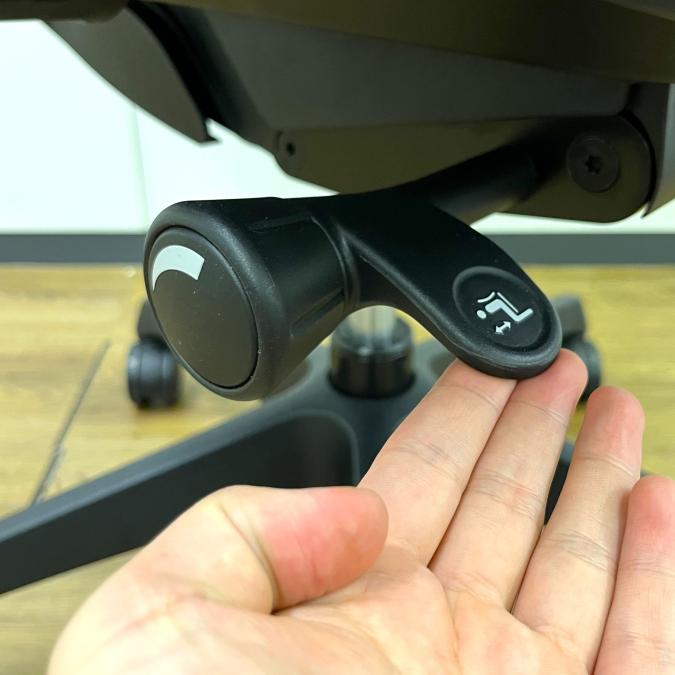 - 座面右下のダイヤル操作で、リクライニングの強弱調整が行えます。これまでのダイヤル式よりも、少ない回転数で、最弱?最強の調整が可能です。