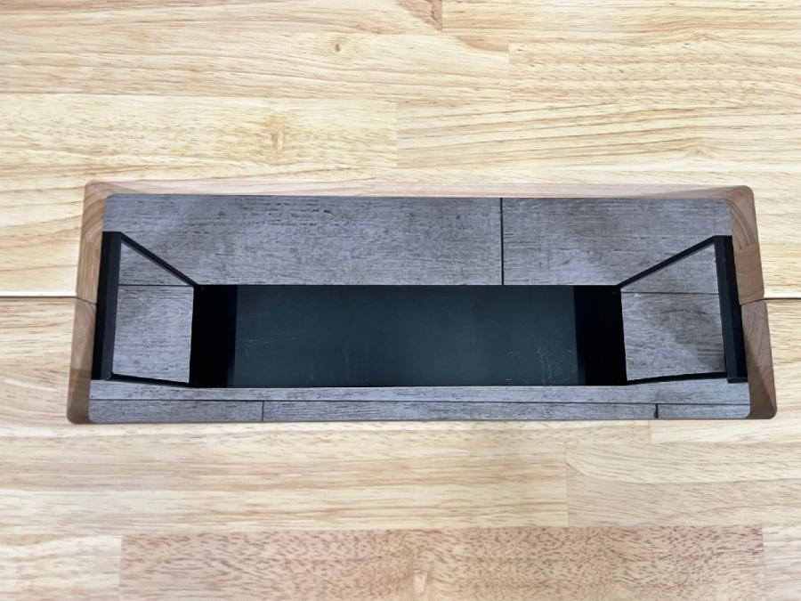 - 目立つ箇所あり傷・凹みが多数、深い傷・凹みが一部ある。(例、天板、幕板、棚板、サイド部分、脚部等にある。)