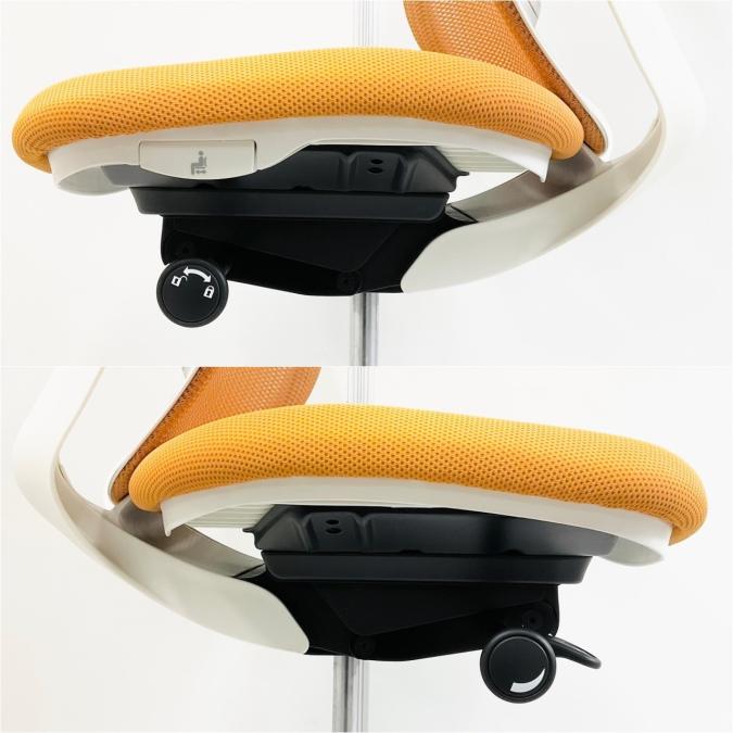 - 座面右下のダイヤル操作で、リクライニングの強弱調整が行えます。これまでのダイヤル式よりも、少ない回転数で、最弱?最強の調整が可能です。
