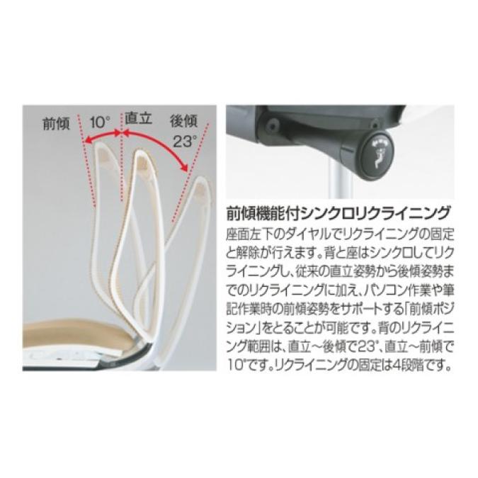 - 椅子と背が連動する「シンクロリクライニング」。リクライニング角度は直立ポジションから前方に10度、後方に23度です。