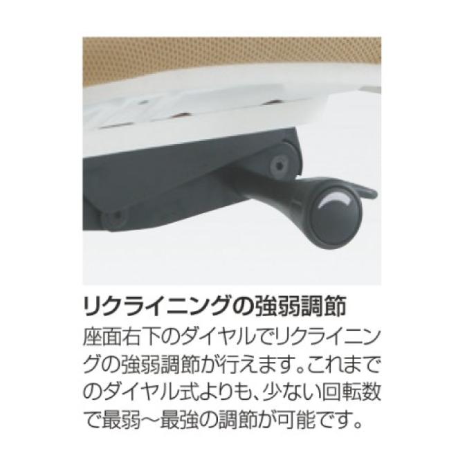 - 座面右下のレバーをスライドさせる「クイックスライドオペレーション」で、リクライニング反力を調整できます。強さの状態が視覚的にわかるため、直感的に操作がおこなえます。