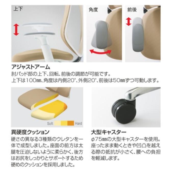 - 肘パッド部の上下(1D)、角度(2D)、前後(3D)、左右(4D)の調整が可能。可動幅は、上下100mm、内側20度、外側10度、前後40mm、左右片側25mmです。