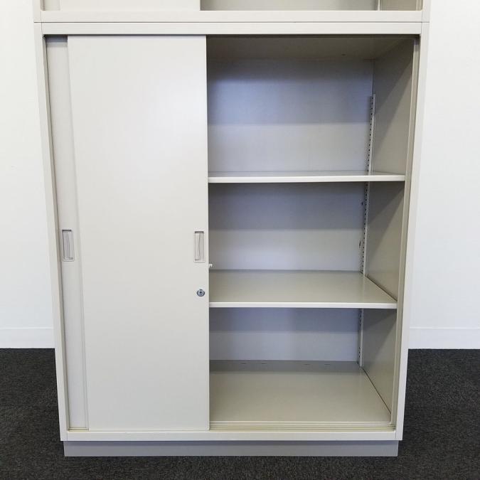 【定価約14万円】【3枚引き違い扉なので開閉スペースがいりません!省スペース化に貢献!】■イトーキ(ITOKI)製 シンライン (THIN LINE)シリーズ 上下引き違い書庫セット 3枚扉 ハイキャビネット ■ニューグレー ■シリンダー錠