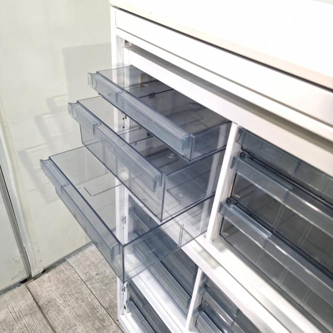【書類・備品整理の必需品!書類や備品のストックにピッタリ!※1段目のみ浅型仕様】オカムラ レクトライン クリスタルトレー 書類 引き出し 透明 ケース ローキャビネット 整理 中古家具 オフィス家具 福岡 九州最大級《オフィスバスターズ福岡博多店は、福岡を拠点として、日本全国へ中古オフィス用品・オフィス家具を提供しております》