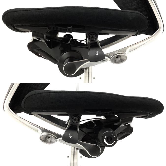 両手を自然に下ろした位置にあるレバーにて、座面の前後スライド調整(前後50mm)が可能です。