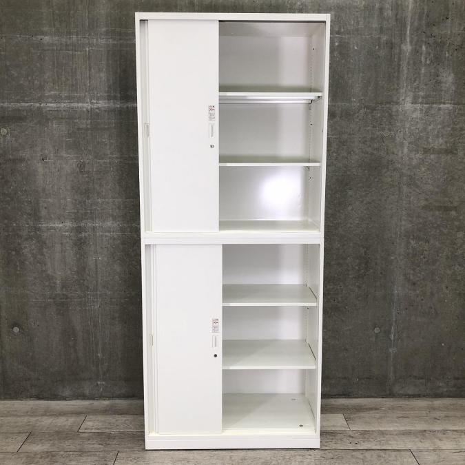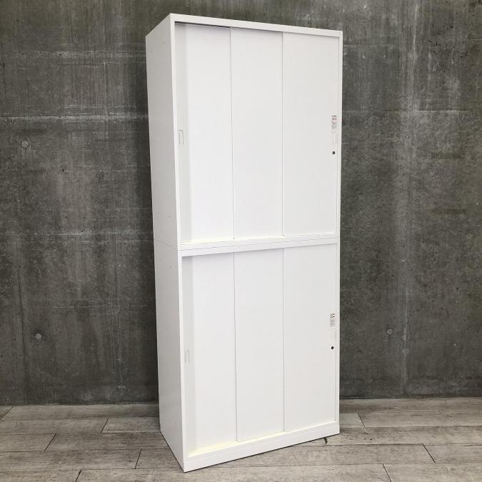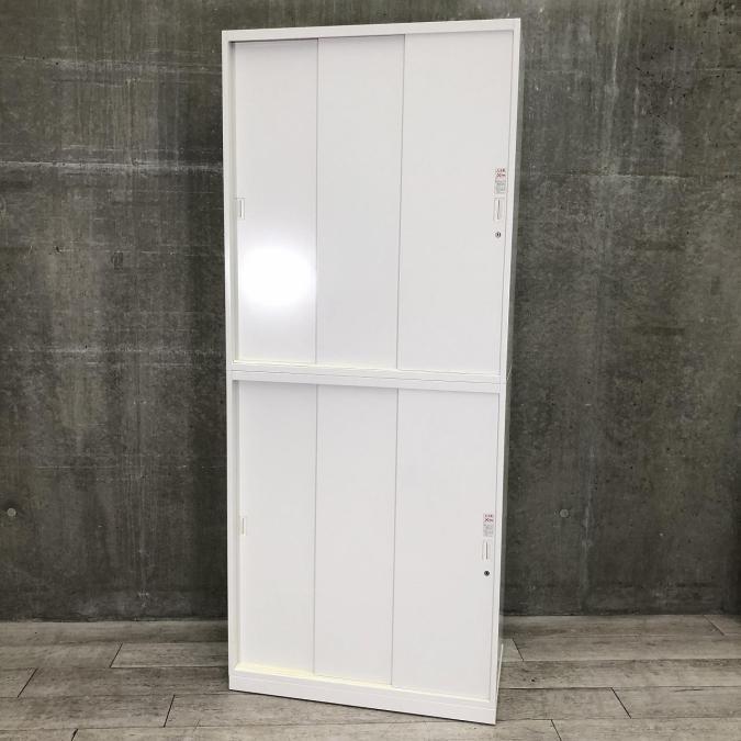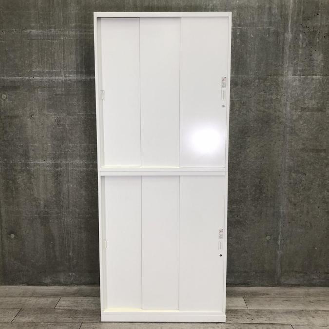 オカムラ製 レクトラインシリーズ ホワイト シリンダー W800xD450xH2150サイズ W800サイズ スリムサイズ 3枚戸タイプ ハイキャビネット スライド引き戸だから開閉スペースに困らない! 上下書庫セット 3枚引き違い書庫セット!!