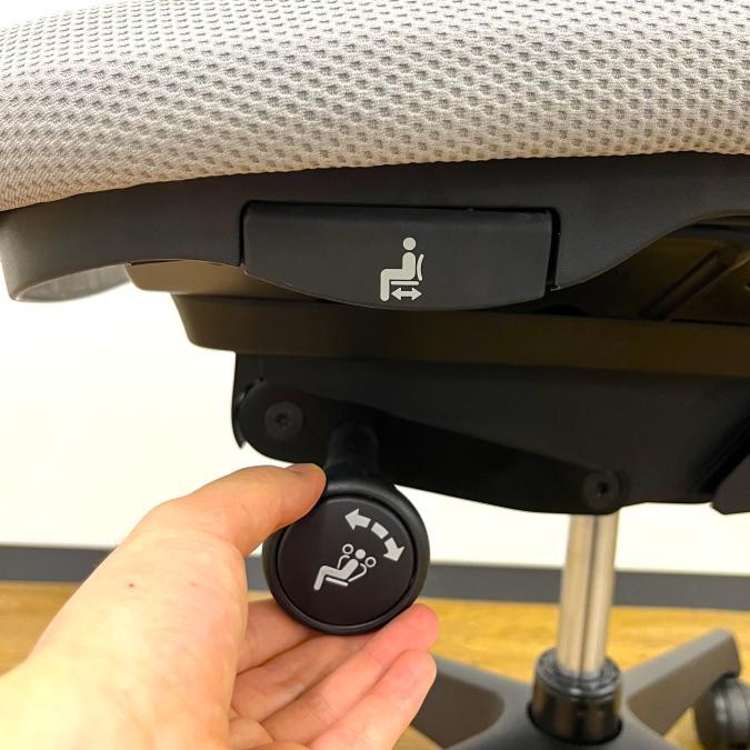 - 座面右下のダイヤル操作で、リクライニングの強弱調整が行えます。これまでのダイヤル式よりも、少ない回転数で、最弱?最強の調整が可能です。
